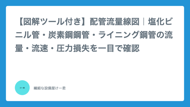 仕事(設備屋の話)【図解ツール付き】配管流量線図|塩化ビニル管・炭素鋼鋼管・ライニング鋼管の流量・流速・圧力損失を一目で確認 2026年4月18日 繊細な設備屋けー君 「配管サイズ、どうやって決めるの?」──新人技術者が最初に直面する疑問のひとつが給水配管の口径選定です。この記事では、建築設備の給水設計で …