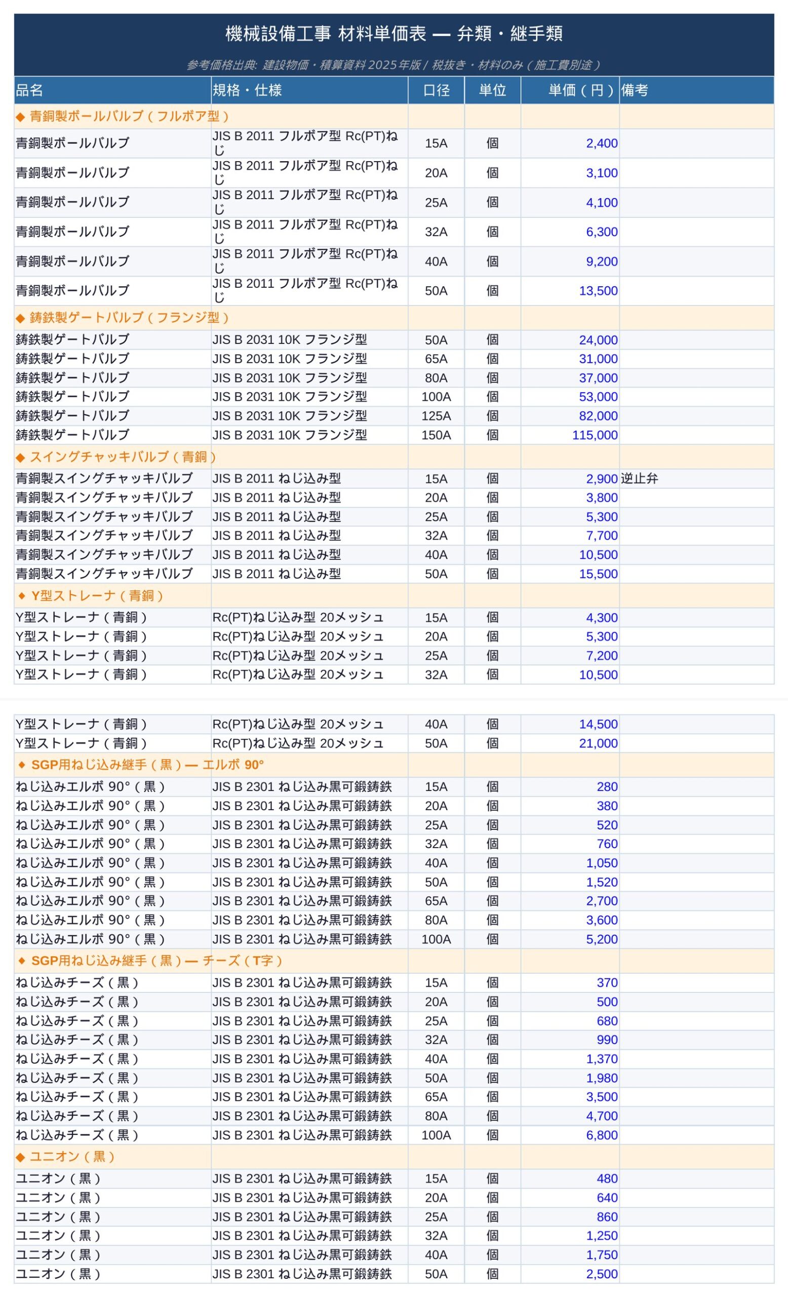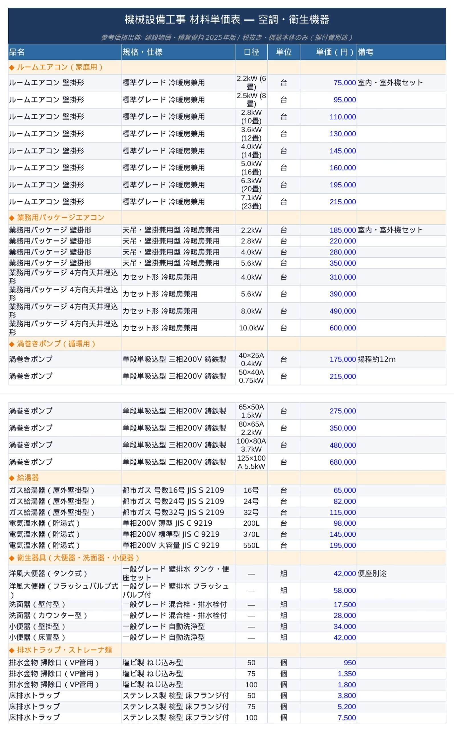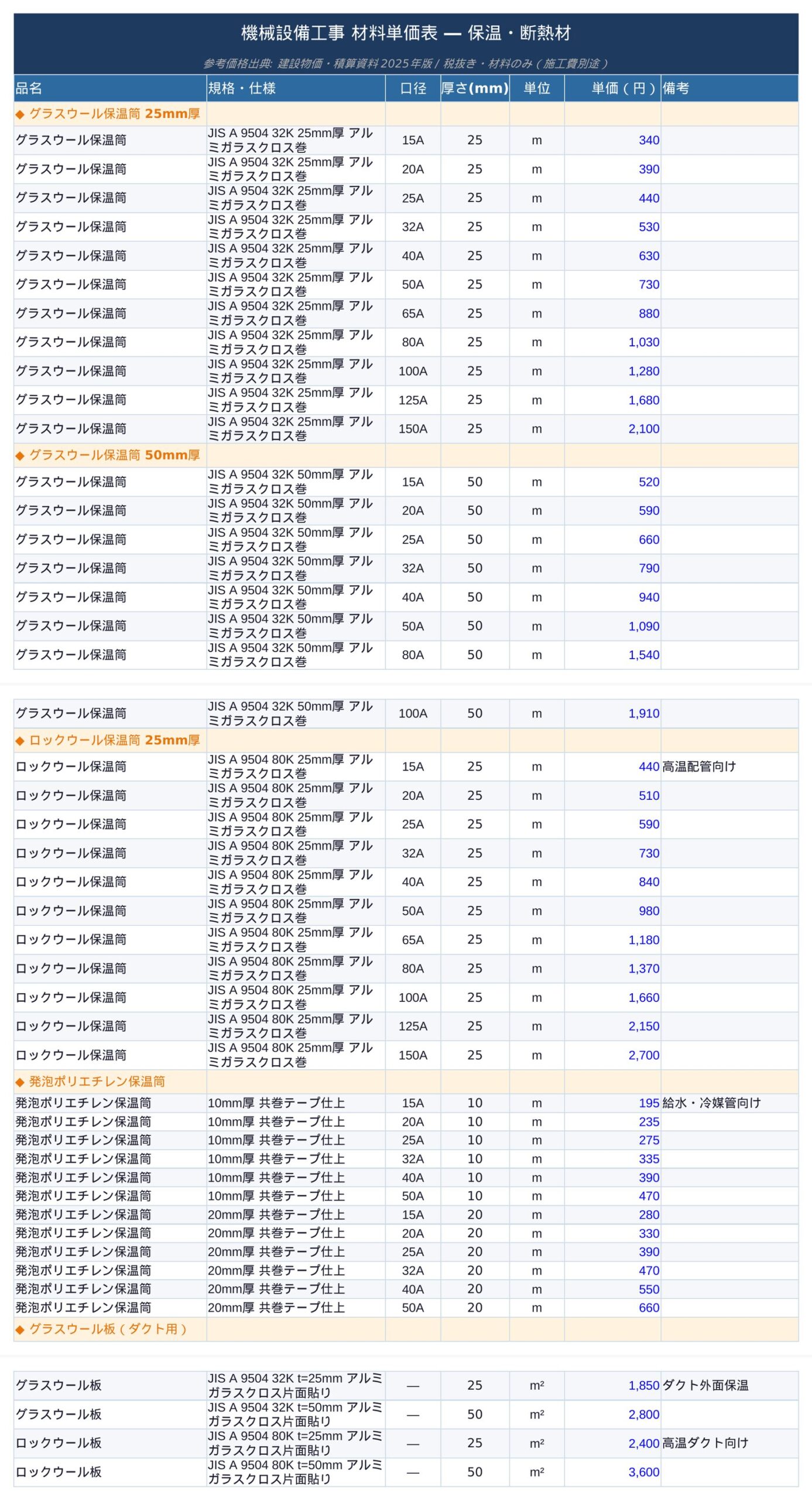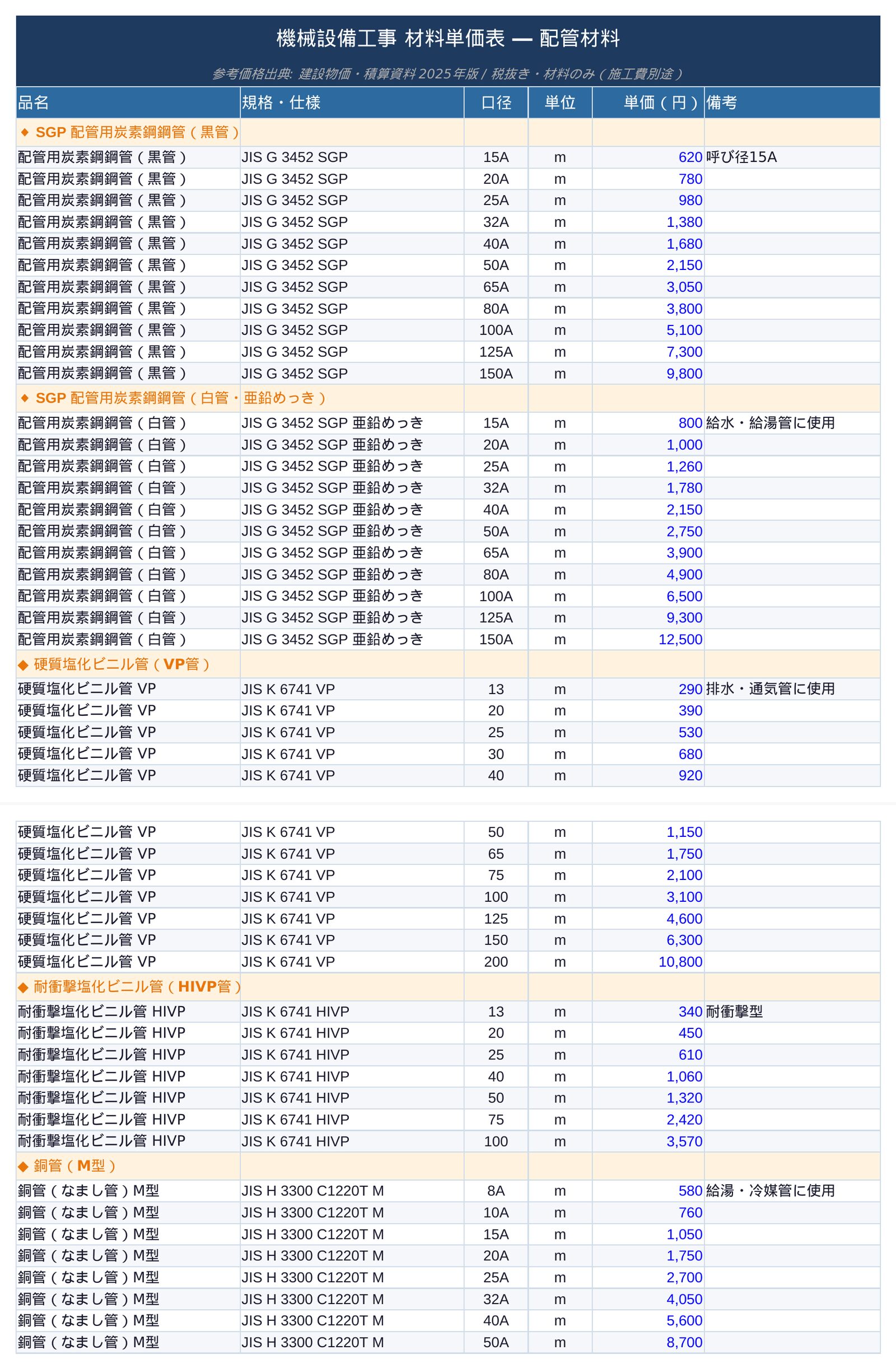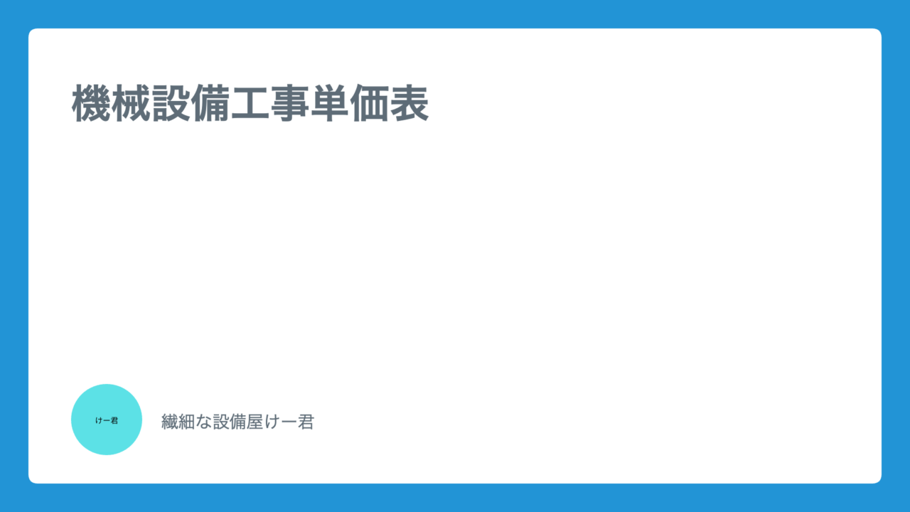 仕事(設備屋の話)機械設備工事単価表 繊細な設備屋けー君 2026年4月10日 スポンサーリンク コンテンツ①配管材料②弁類継手類③保温断熱④空調衛生機器①配管材料②弁類継手類③保温断熱④空調衛生機器ABOUT ME繊細な設備屋けー君設備施工管理として10年働いております。 図面作成他何かお手伝いできる事がございましたらご連絡お願いいたします 資格・・1級管工事施工管理技士、甲種Ⅰ類消防設備士、電気工事士です どうかぜひとも読んでいって下されば幸いですBLOG:https://trap-koikoi-annba-tann.comスポンサーリンク スポンサーリンク