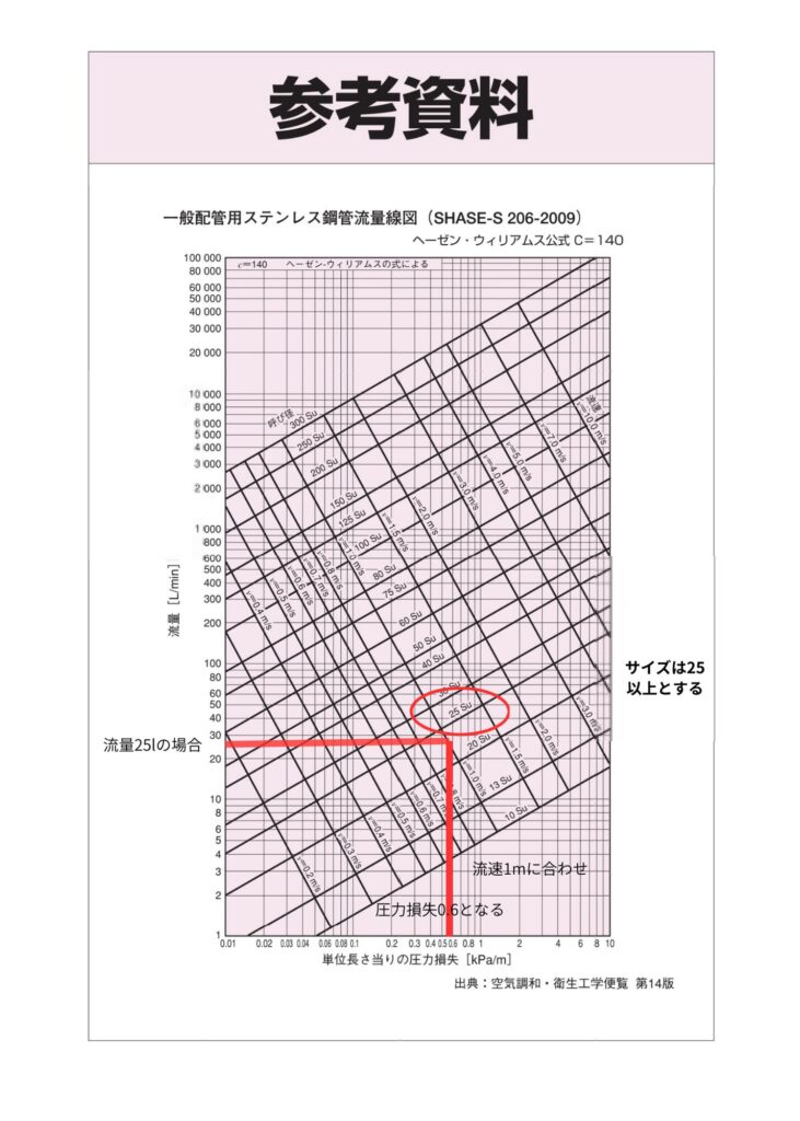 管材ごとに適正流速が決まっていますが、給湯配管の基本:1.0 m/s以下を基準で考えます