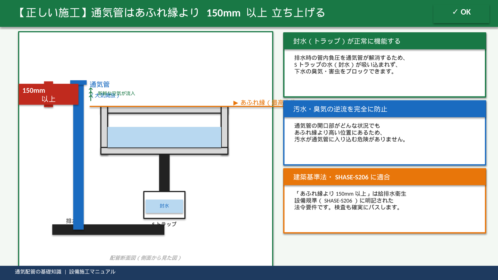 📗 図1:正しい施工 — 通気管をあふれ縁より150mm以上立ち上げた状態