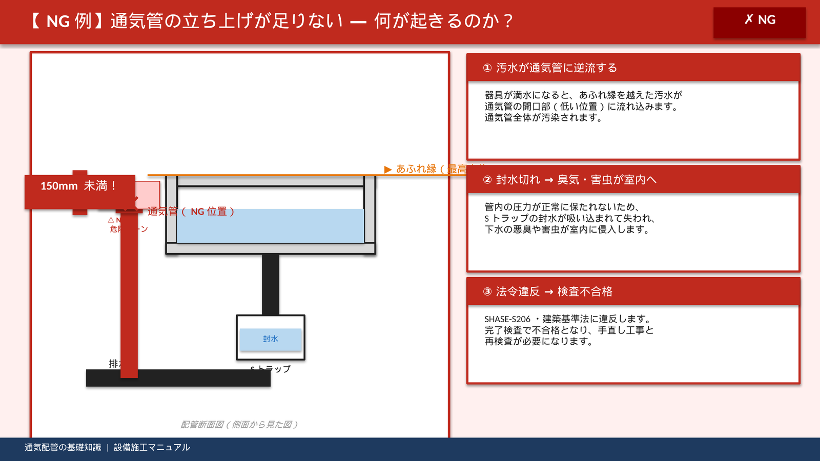 🚫 図2:NG例 — 通気管の立ち上げが不足している状態