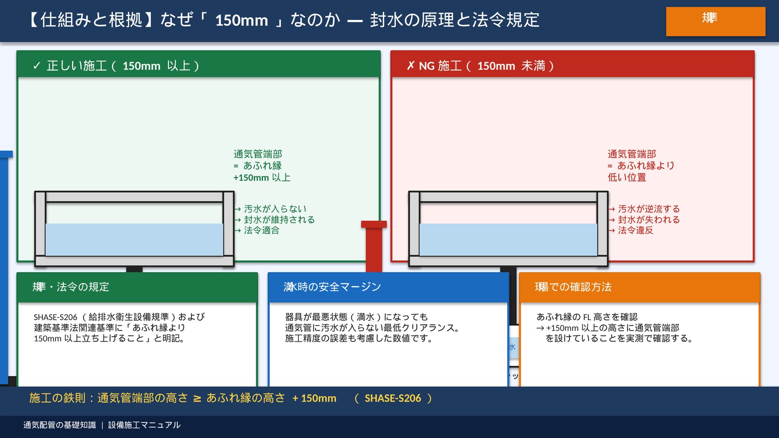 📘 図4:仕組みと根拠 — トラップ封水の原理と150mm規定の意味