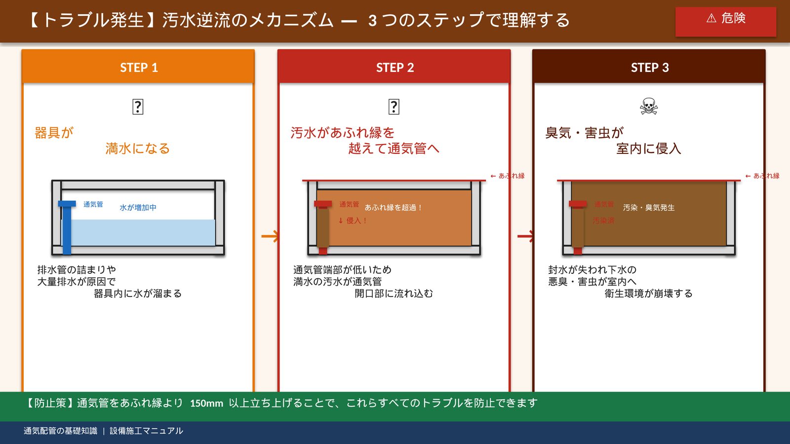 ⚠️ 図3:トラブル発生 — 汚水が通気管に逆流するメカニズム